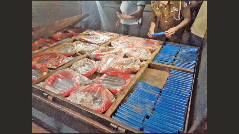 Police yesterday arrested two suspects who were transporting high-powered explosives in a lorry at Vilattawa in the Kurunegala – Mannar road. The lorry had been stopped at a road checkpoint in Vilattawa and the explosives were found in a secret compartment built inside the lorry. The police found 89 plastic pipes filled with gelignite, service threads used for explosions, 900 electric detonators used to detonate bombs in the secret chamber.