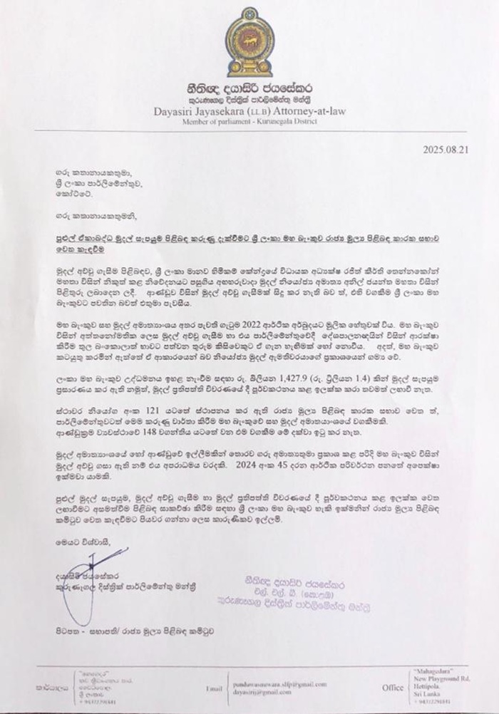Jayasekara requested that the Central Bank be summoned to provide clarification on the monetary expansion, failure to meet stated targets, and the institution’s accountability under Article 148 of the Constitution. A copy of the letter was also sent to the chair of the Committee on Public Finance (COPF). (Newswire)
