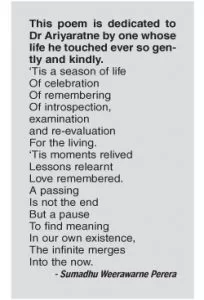 He once related to me a story to illuminate the priorities one should have in life. It was drawn from the great Russian novelist Tolstoy. The story was about a king who wanted the answer to three questions—what is the most important time in a person’s life? Who is the most important person? What is the most important thing to do? Wise (and not-so-wise) persons he questioned gave many and varied answers. Some said the time of birth (astrology), the father or mother, earning well, as their answers to these three questions. Tolstoy’s answer, which met with Dr Ariyaratne’s approval, was—the most important time is now, the most important person is the person you are with now, and the most important thing to do is to love and serve that person. When Dr Ariyaratne engaged with undivided attention with those he was with (including myself) and held their hands as he spoke looking at their faces, he lived this story.
