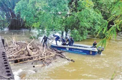 Following heavy rains, tree remains and other debris, brought by raging waters of Gin River, collect under the Agaliya and Dodangoda bridges hampering smooth flow of river water. Remaining ever alert to these developments, the Sri Lanka Navy often clears blockages beneath those bridges, to avert possible flood threat in low-lying areas. In continuation of these efforts, a team of Navy personnel attached to the Southern Naval Command were pressed into action to clear the blockages under the Agaliya and Dodangoda bridges, averting a possible flood situation.