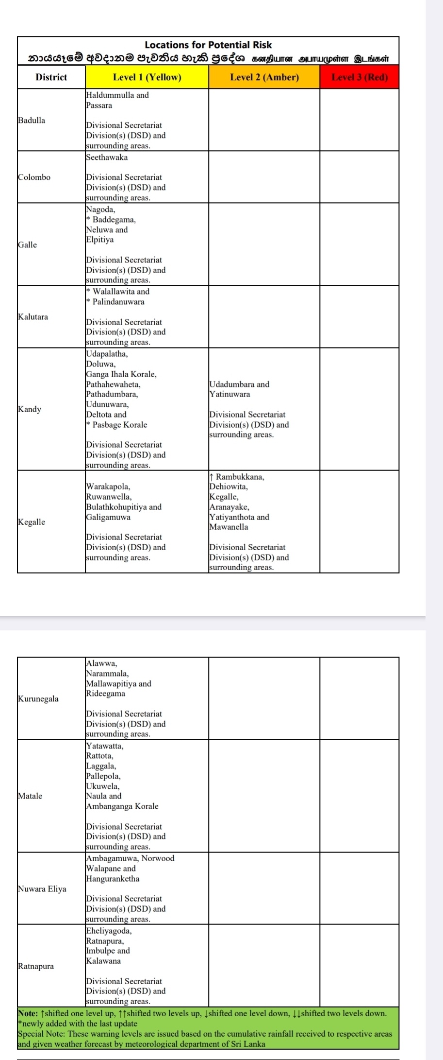 * **Level 3 (Red Alert – High Risk):** Areas in Kegalle including Rambukkana, Dehiowita, Kegalle, Aranayake, Yatiyanthota, and Mawanella.