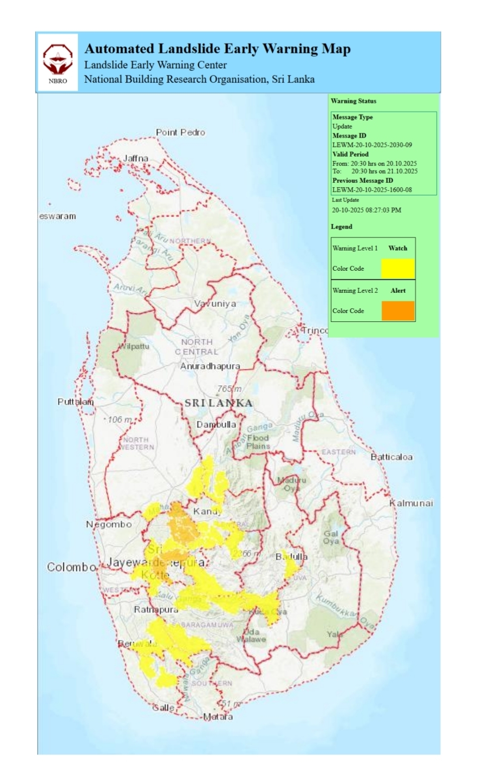 The National Building Research Organisation (NBRO) has issued a landslide early warning for ten districts, effective from 8:30 p.m. today (20) until 8:30 p.m. tomorrow (21).