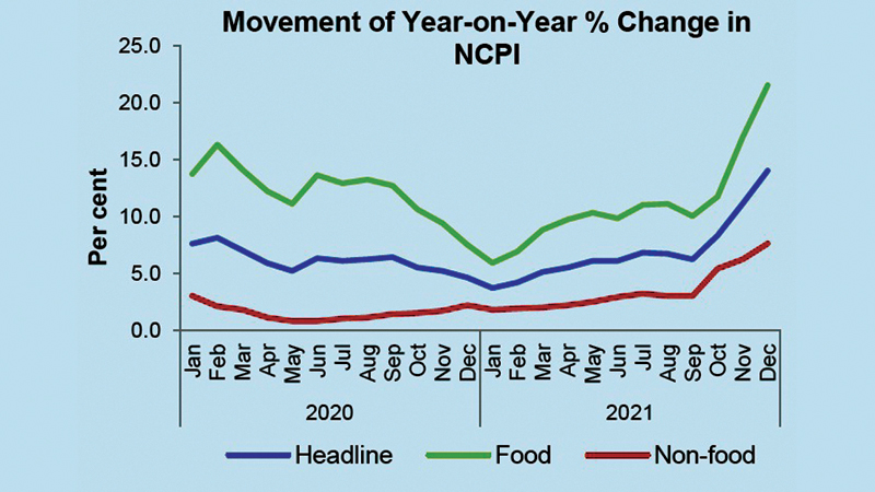 Headline inflation, as measured by the year-on-year (Y-o-Y) change in the National Consumer Price Index (NCPI, 2013=100)1, increased to 14.0 per cent in December 2021 from 11.1 per cent in November 2021. Meanwhile, on an annual average basis, the NCPI increased to 7.0 per cent in December 2021 from 6.2 per cent in November 2021.