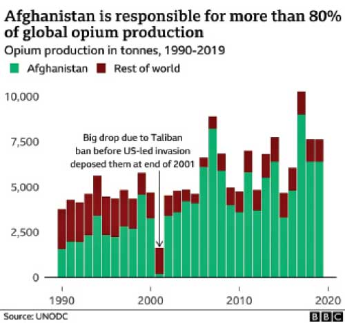 Afghanistan is the world’s largest producer of opium, according to the United Nations Office on Drugs and Crime (UNODC). Its opium harvest accounts for more than 80% of the world’s supply.