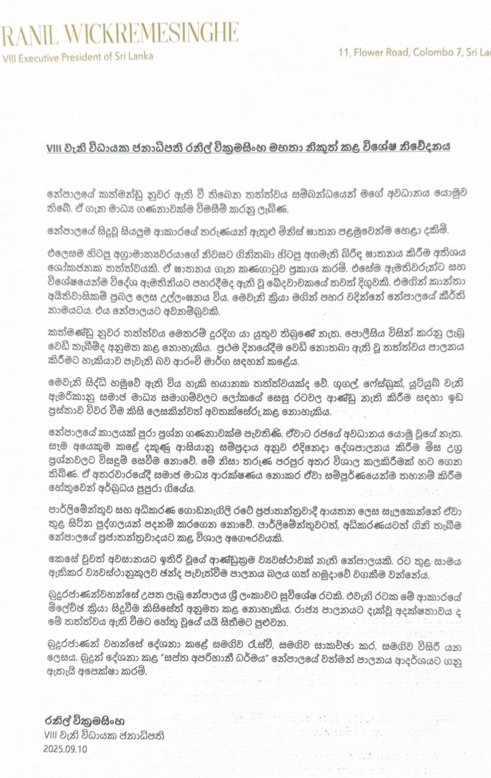 Special statement issued by the VIII Executive President Ranil Wickremesinghe
