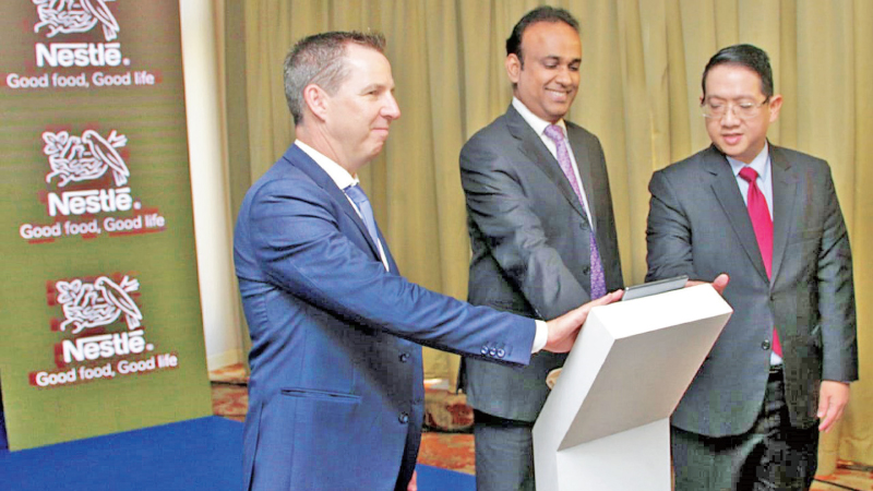 Minister of Industries and Plantations Dr Ramesh Pathirana, Nestlé Lanka Managing Director, Jason Avancena and Managing Director – Designate, Bemhard Stefan launching the project. Picture by Wimal Karunatillake