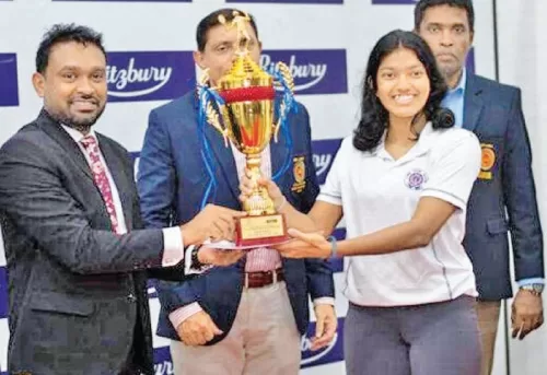 Chanithma Sinale receiving the Ritzbury Junior National Girls’ Squash Champion trophy from Ritzbury Group Manager Aruna Liyanapathirana. Squash Federation President Dhammika Wijesundara and Secretary Eranga Alwis are also in the picture.