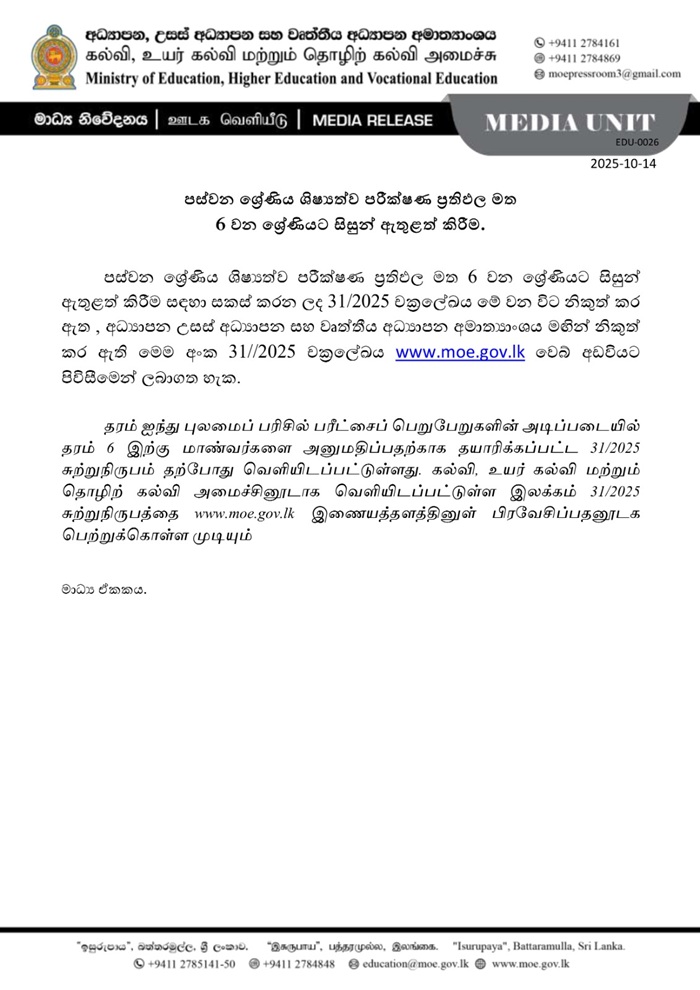 The Ministry of Education has issued a circular related to the admission of students to Grade 6 based on the results of the Grade 5 Scholarship Examination.