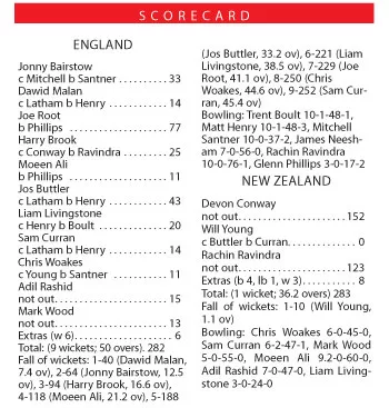 Mitchell Santner and part-time off-spinner Glenn Phillips made good spells to cause some damage to the English side in the middle part of the innings.