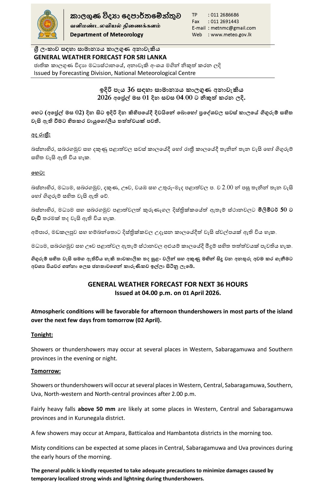 In its latest forecast issued at 4.00 p.m. today, the department said atmospheric conditions will be favorable for afternoon thundershowers in most parts of the island from tomorrow (02).