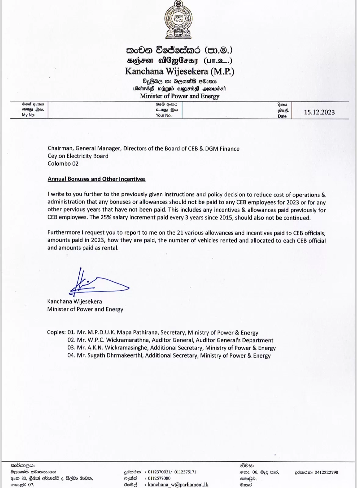Issuing a letter the Minister of Power and Energy Kanchana Wijesekera said that the Ceylon Electricity Board (CEB) employees will not receive any bonuses for 2023 due to the financial challenges and streamline operational costs.