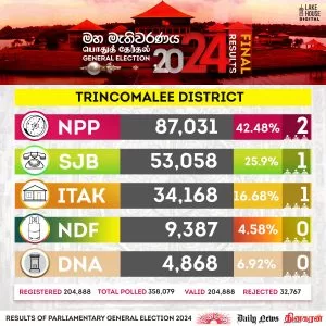 NPP gets 2 from Trincomalee 1 each for SJB and ITAK Local On Nov 15, 2024 trinco 1 300x300 1 0 4 Share Parliamentary Elections 2024 Results – Trincomalee District The post NPP gets 2 from Trincomalee 1 each for SJB and ITAK appeared first on DailyNews. 0 4 Share FacebookTwitterGoogle+ReddItWhatsAppPinterestEmail