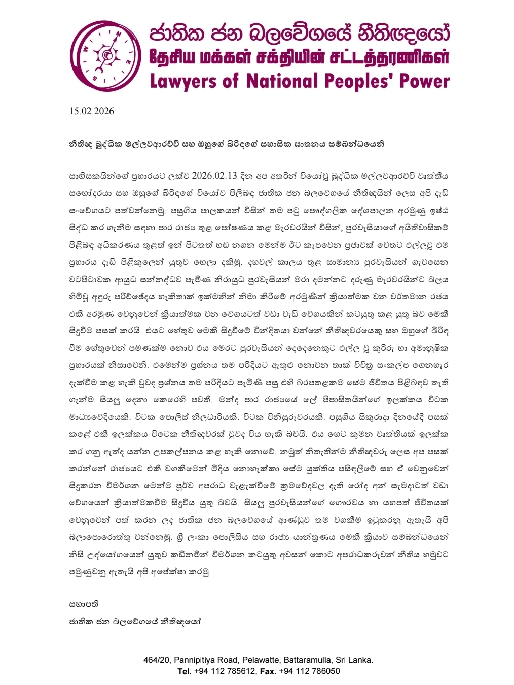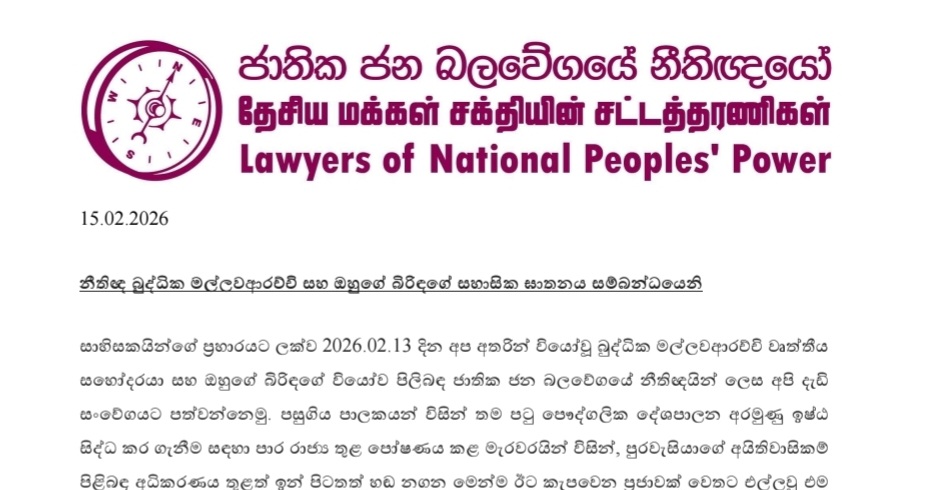 In a statement issued on February 15, the NPP Lawyers’ Association expressed deep sorrow over the deaths of Mallawaarachchi and his wife, who were killed in a shooting on February 13.