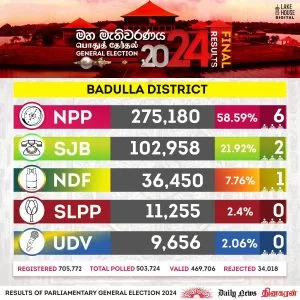NPP wins Badulla with 6 seats, SJB gets 2, NDF gets 2 Local On Nov 15, 2024 466614248 1021473053325926 6572466991620083152 n 300x300 1 0 4 Share Parliamentary Elections 2024Results – Badulla District The post NPP wins Badulla with 6 seats, SJB gets 2, NDF gets 2 appeared first on DailyNews. 0 4 Share FacebookTwitterGoogle+ReddItWhatsAppPinterestEmail