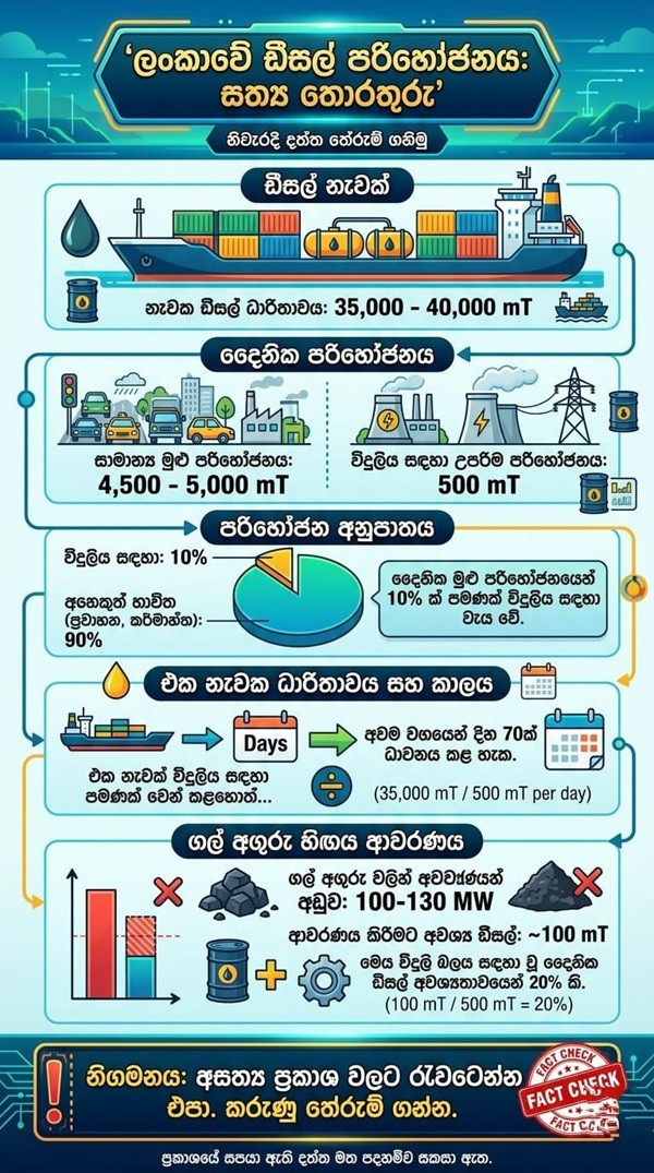 Gunasena further noted that the reduction in electricity supply from coal amounts to around 100–130 MW, which requires approximately 100 MT of diesel, about 20% of the daily electricity fuel requirement.