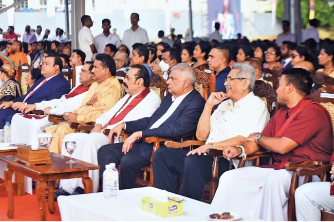 President Ranil Wickremesinghe, former Presidents Mahinda Rajapaksa and Gotabaya Rajapaksa, former Minister Basil Rajapaksa, National Organizer of SLPP Namal Rajapaksa, MP, and entrepreneur Dhammika Perera MP at the ceremony.