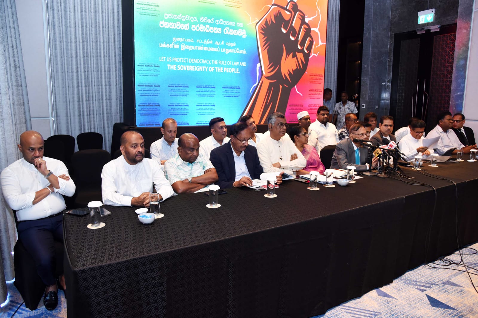 Opposition party leaders met in Colombo today under the theme “Protecting Democracy, Rule of Law and the Sovereignty of the People”.