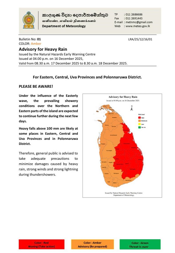 The Department of Meteorology has issued an advisory for heavy rain in the Eastern, Central, and Uva Provinces and the Polonnaruwa District.