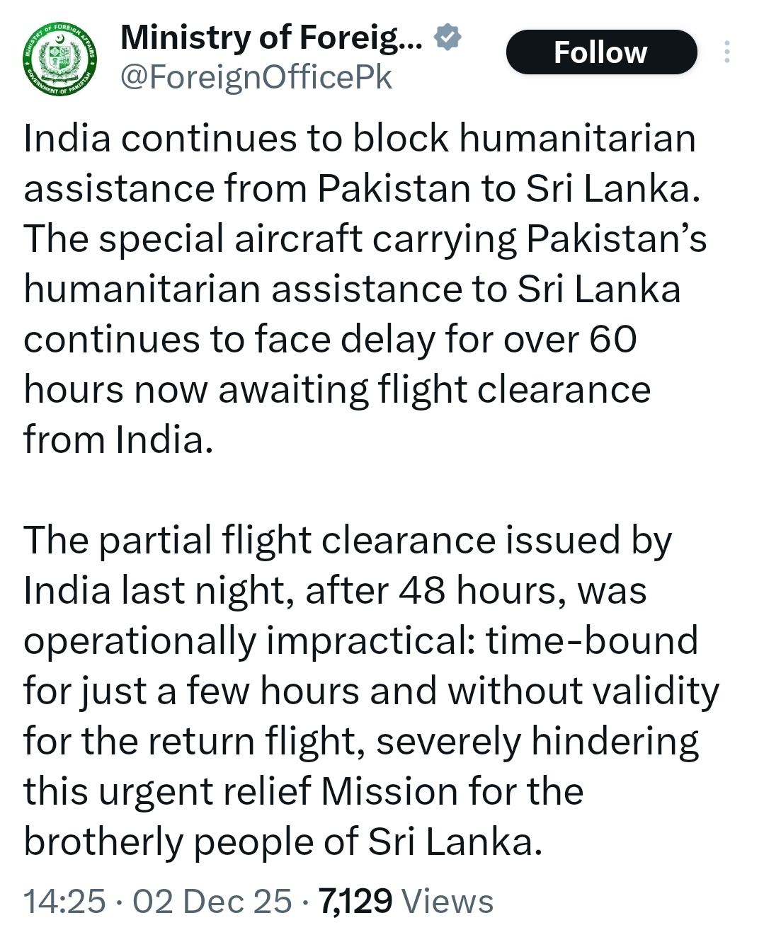 In a statement posted on X, the ministry said the aircraft, which is carrying emergency supplies for flood-affected Sri Lankans, has faced repeated delays due to a lack of overflight approval from India.