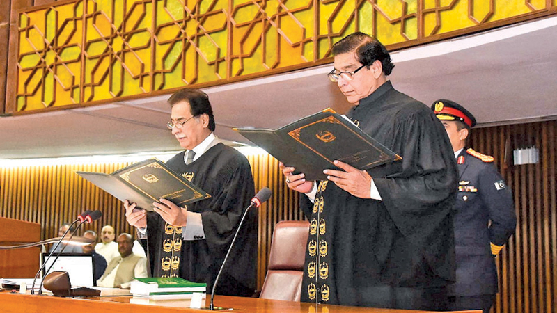 Raja Pervaiz Ashraf from the Pakistan People’s Party (PPP) takes oaths as the 22nd Speaker of the National Assembly of Pakistan from Ayaz Sadiq, a member of the panel of the Chairman, at Parliament House on Saturday.
