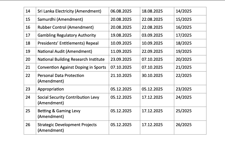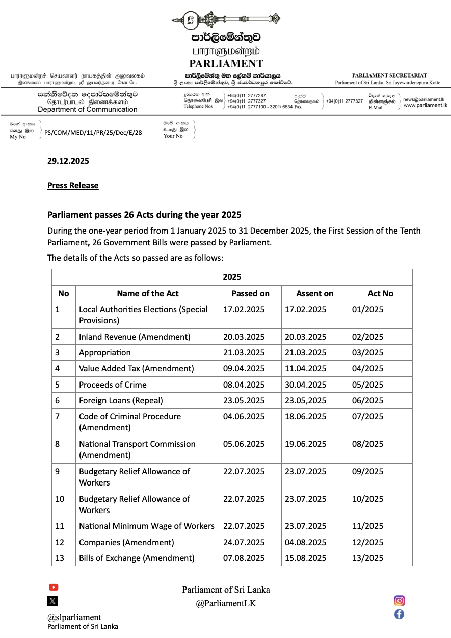 Between January 1 and December 31, 2025, during the first session of Sri Lanka’s 10th Parliament, a total of 26 government bills were passed.