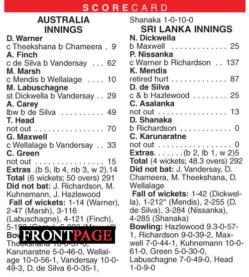 Australia opted to bat first after skipper Aaron Finch won the sixth toss in a row on this tour. Their plan was very clear to build up a big total in their 50 overs and piled up 291 for 6 wickets. The openers Finch and David Warner couldn’t get a good start as paceman Dushmantha Chameera made an early breakthrough to dismiss Warne in the third over of the innings helped by a good running catch taken by Maheesh Theekshana at fine leg.