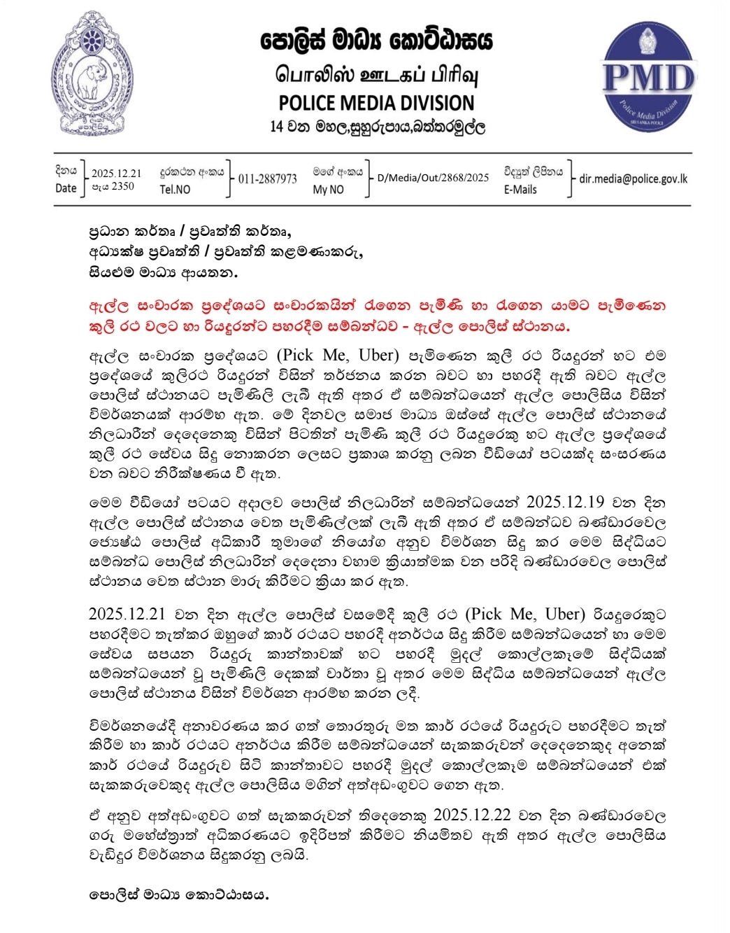 Police said a video circulating on social media claimed that officers had instructed ride-hailing drivers not to operate in the area. Authorities clarified that a complaint regarding police conduct was received on December 19, and an inquiry was conducted under instructions from senior police officials. As a result, two police officers linked to the complaint were transferred with immediate effect pending further inquiries.