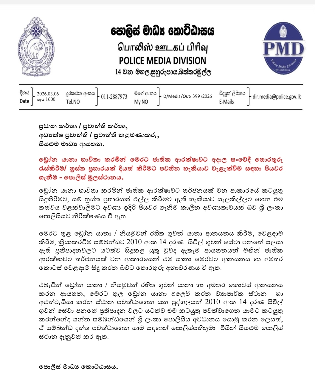 Police noted that the import, trade and operation of drones in Sri Lanka must be carried out in accordance with provisions under the Civil Aviation Act No. 14 of 2010.