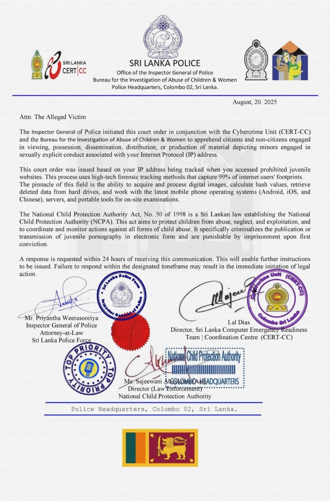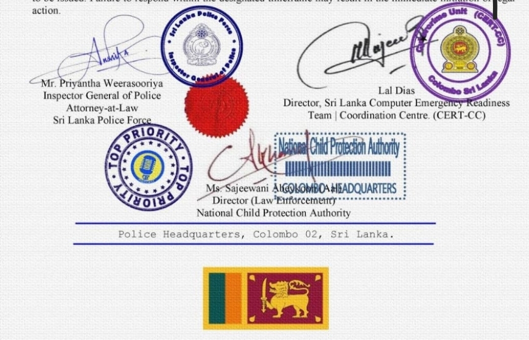 The Sri Lanka Police categorically states that no such letter has ever been issued by the Inspector General of Police or by any authorized division of the Sri Lanka Police. This document is a deliberate act of misinformation and an attempt to mislead the public.