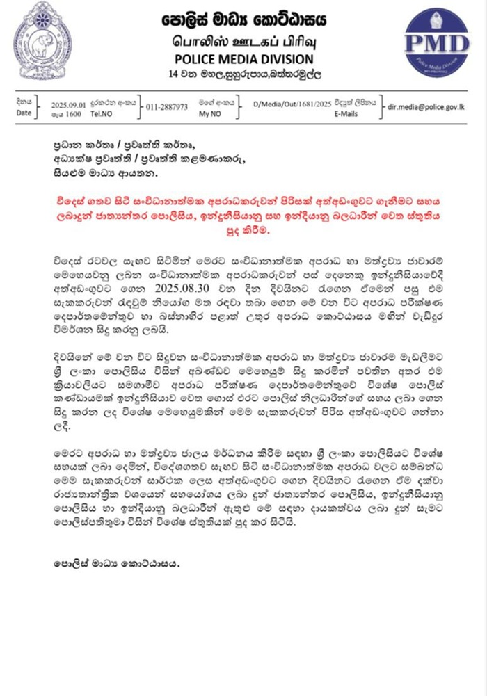 Inspector General of Police (IGP) Priyantah Weerasooriya has extended his gratitude to all those who assisted the operations, including INTERPOL, Indonesian Police, and Indian authorities, to capture the wanted Sri Lankan criminals who were hiding overseas.