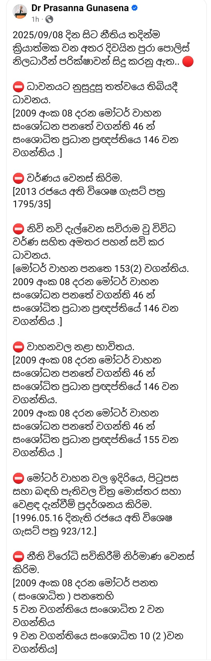 Sri Lankan police will launch a nationwide crackdown on illegal vehicle modifications and unsafe driving practices from September 8, Deputy Transport Minister Dr. Prasanna Gunasena announced.