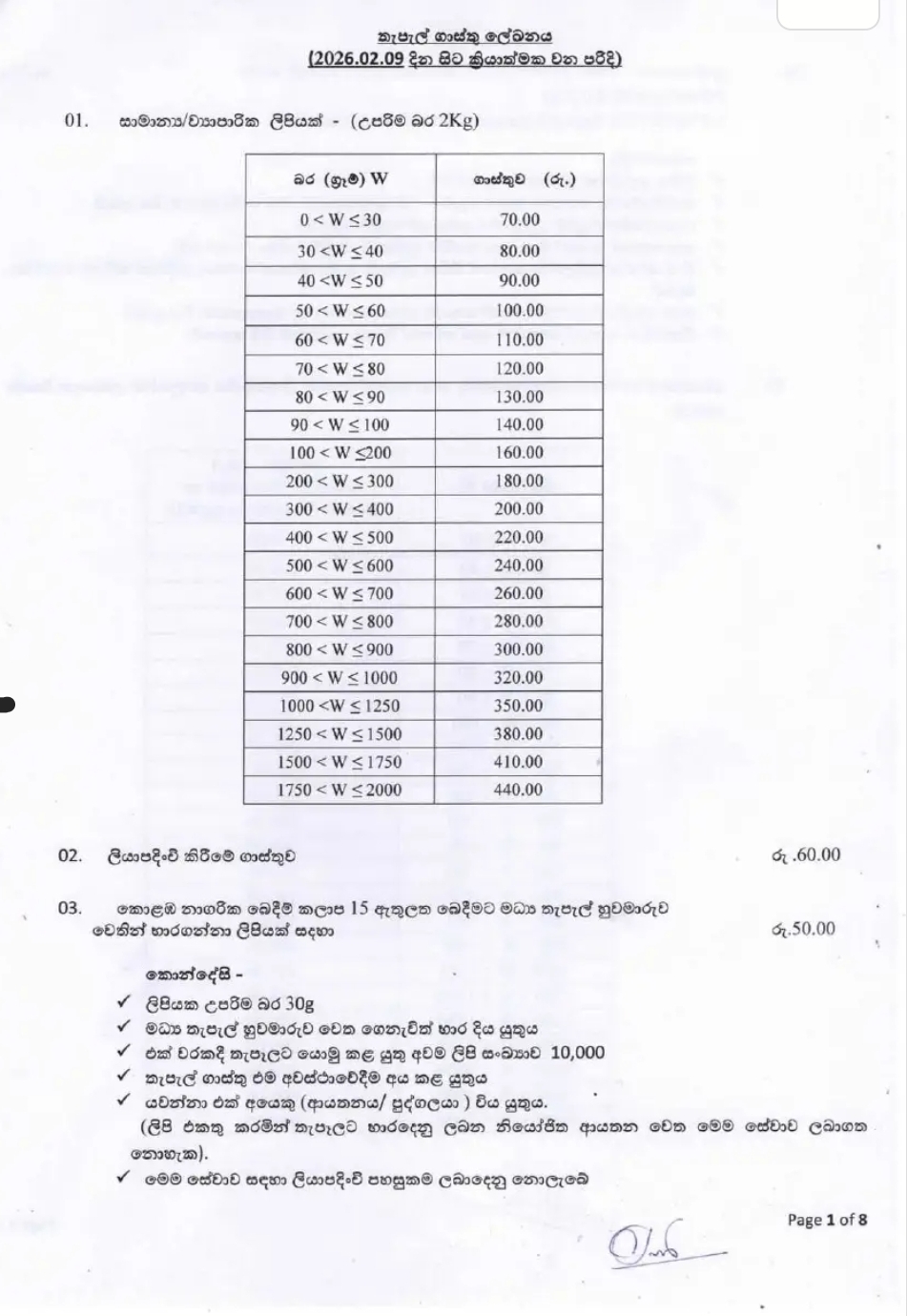 The Department of Posts has announced an increase in postal charges, effective from Monday (February 9).