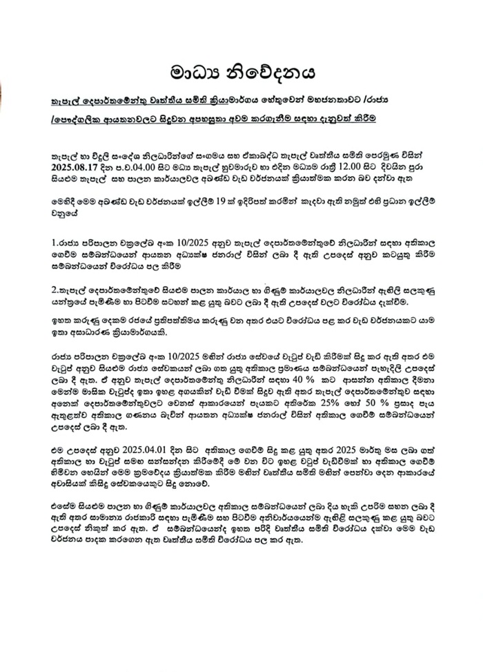 This strike is being launched over 19 demands, with primary concerns on opposition to overtime payment guidelines issued by the Director General of Institutions, based on Public Administration Circular No. 10/2025, which outlines overtime procedures for postal department officers, and opposition to mandatory fingerprint attendance tracking for officers in all administrative and accounting offices of the postal department.