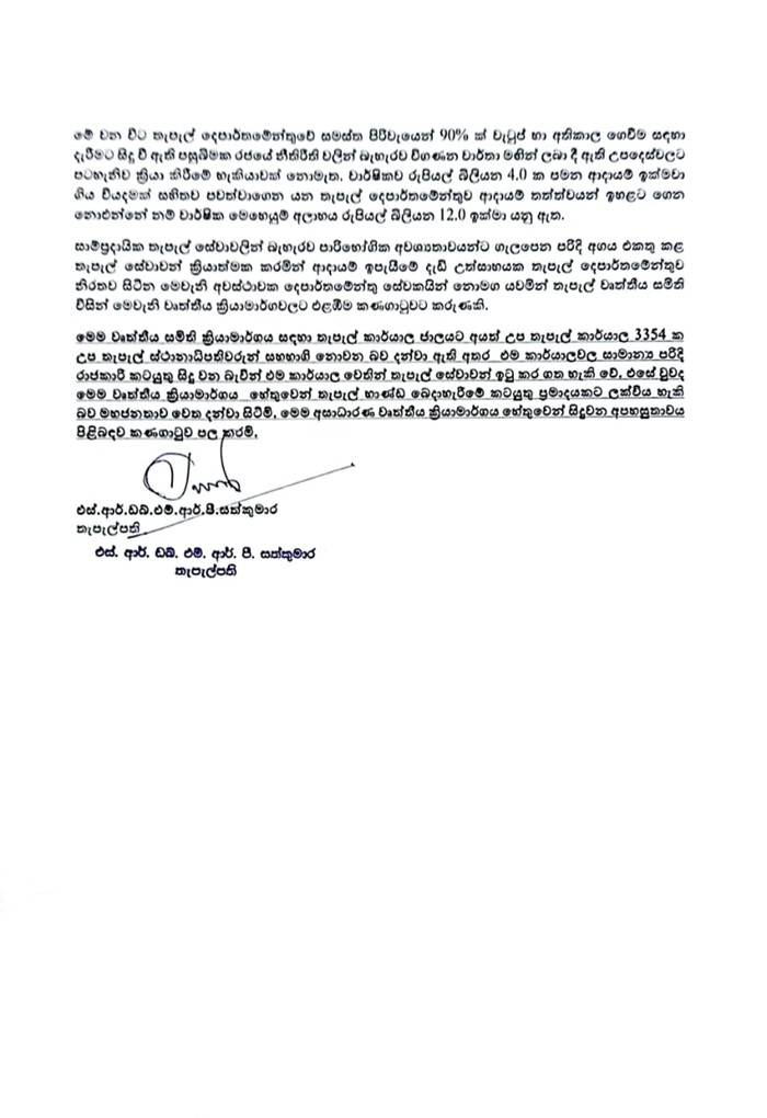 Ruwan Sathkumara went on to note that out of 3,354 sub-post offices, sub-postmasters have declared they will not participate in the strike, adding that these offices will continue to operate normally, and postal services will be available through them.
