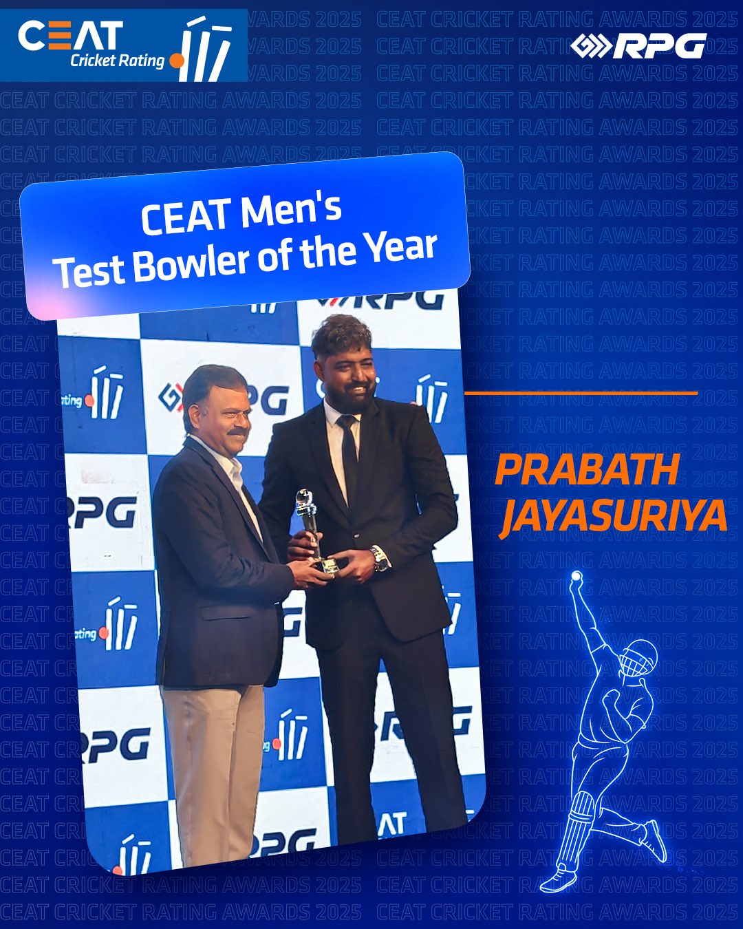 Sri Lanka’s Prabath Jayasuriya was named the CEAT Men’s Test Bowler of the Year at the CEAT Cricket Awards held in Mumbai tonight, recognizing his precision, consistency, and match-winning spells in the longest format.