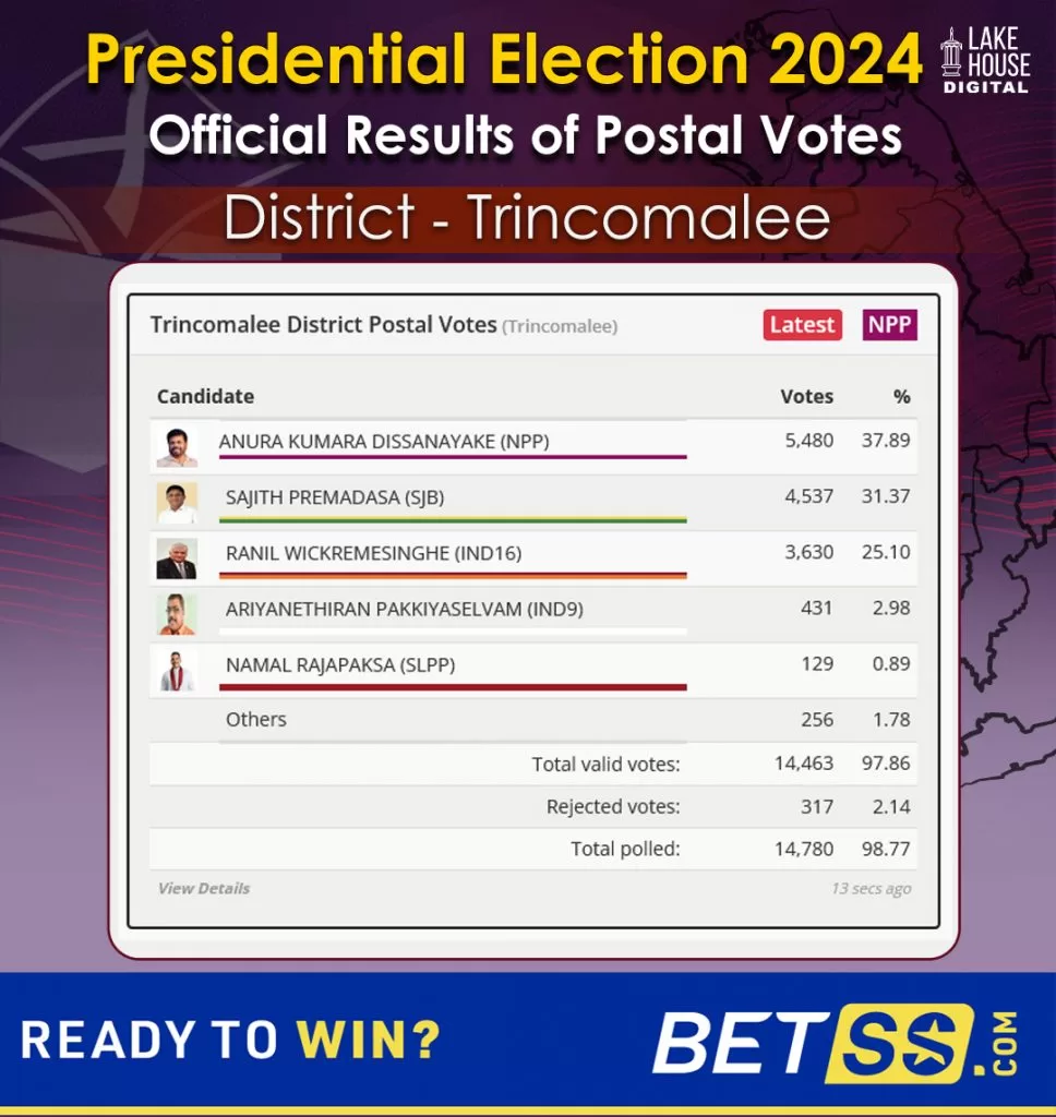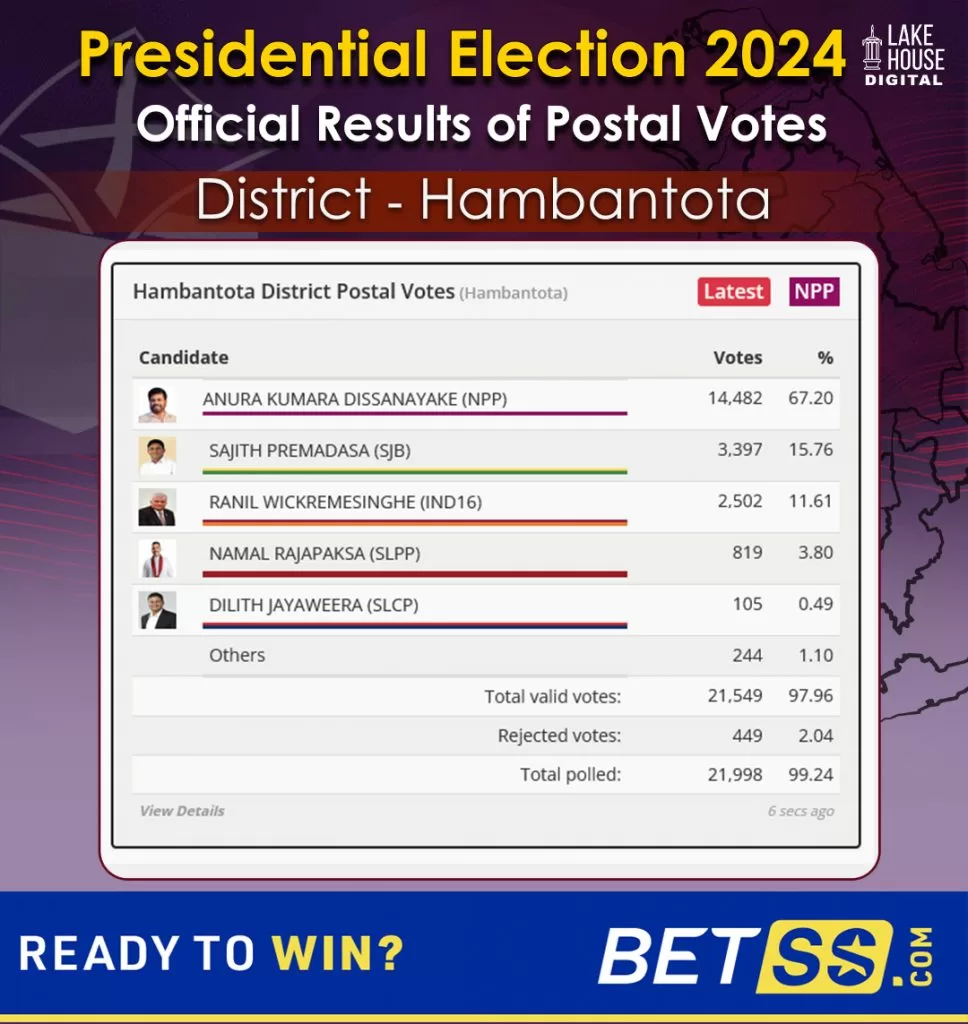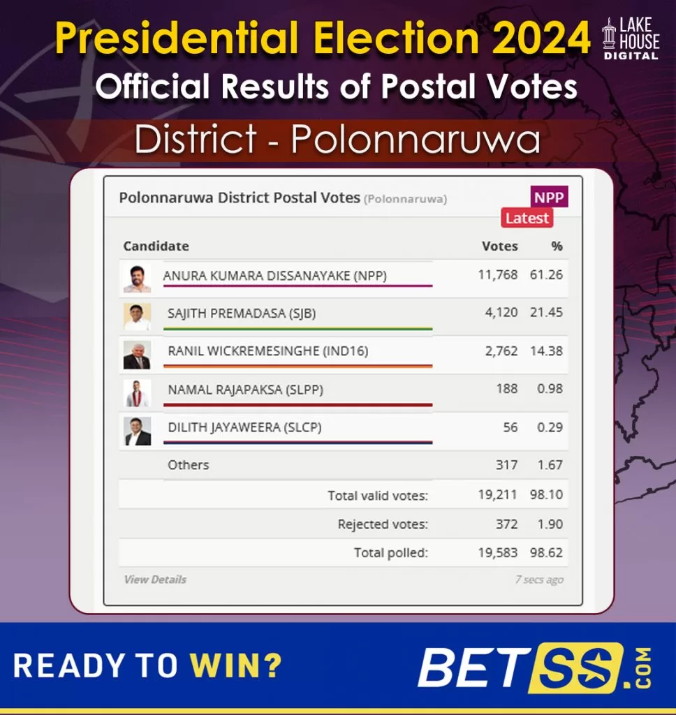 Presidential Election: Five District postal vote results released Politics On Sep 21, 2024 FB IMG 1726947708958 968x1024 1 0 0 Share The post Presidential Election: Five District postal vote results released appeared first on DailyNews. 0 0 Share FacebookTwitterGoogle+ReddItWhatsAppPinterestEmail