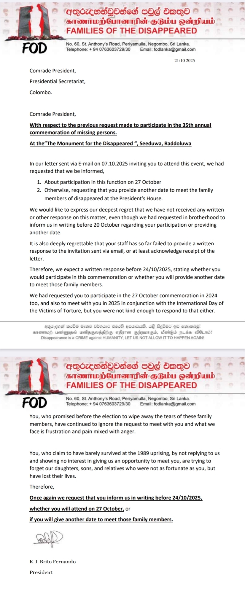 FoD President Brito Fernando said that despite multiple written invitations sent on October 13 and October 21, the President has not responded — neither confirming participation in the event nor offering a date to meet the families of victims who vanished during the 1989 southern violence and the civil war.