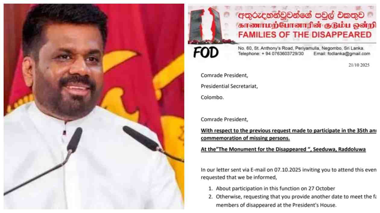 FoD President Brito Fernando said that despite multiple written invitations sent on October 13 and October 21, the President has not responded — neither confirming participation in the event nor offering a date to meet the families of victims who vanished during the 1989 southern violence and the civil war.