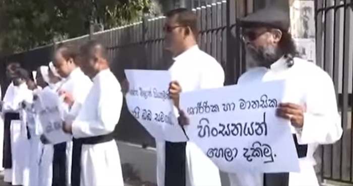 Priests and nuns staged a silent protest in front of the Negombo Municipal Council today, condemning the recent assault of a catholic priest by six police officers from the Gampaha Division Crimes Investigation Unit’s motorcycle squad.