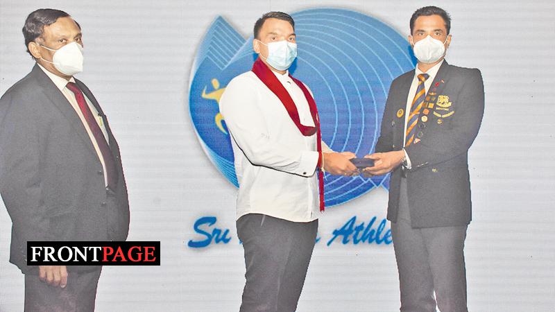 W.K.A.S. Priyanthalal who obtained highest marks at the World Athletics Technical officials Education and Certification System (TOECS) Level one course receiving special award from Sports Minister Namal Rajapaksa at the Sri Lanka Athletics centenary celebrations launching ceremony held at Grand Monarch, Thalawathugoda last Wednesday .