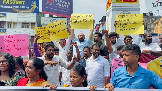 A large protest was held in Batticaloa today (28) against the provisions of the Prevention of Terrorism Act (PTA) and the proposed Prevention of State Terrorism Act (PSTA).