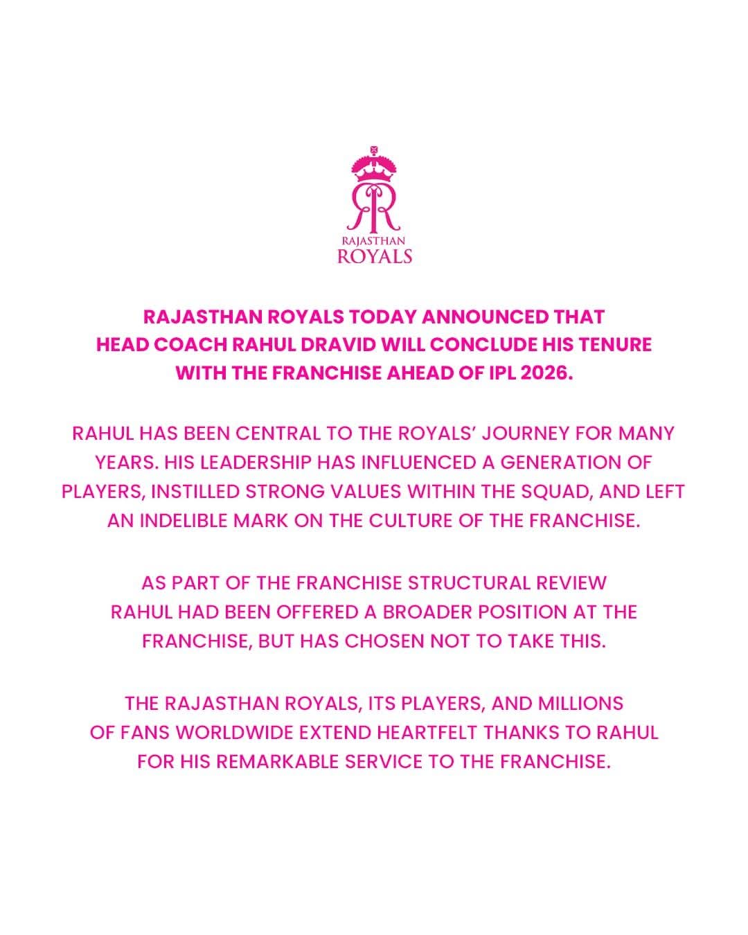 Rajasthan Royals have announced that head coach Rahul Dravid will step down from his role with the franchise ahead of IPL 2026.