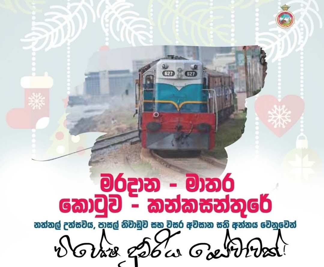 Accordingly, a special express train will operate from Maradana to Matara on Dec. 24, departing at 3:00 p.m. The return service is scheduled to leave Matara on Dec. 29 at 5:00 a.m., arriving at Colombo Fort at 8:30 a.m.