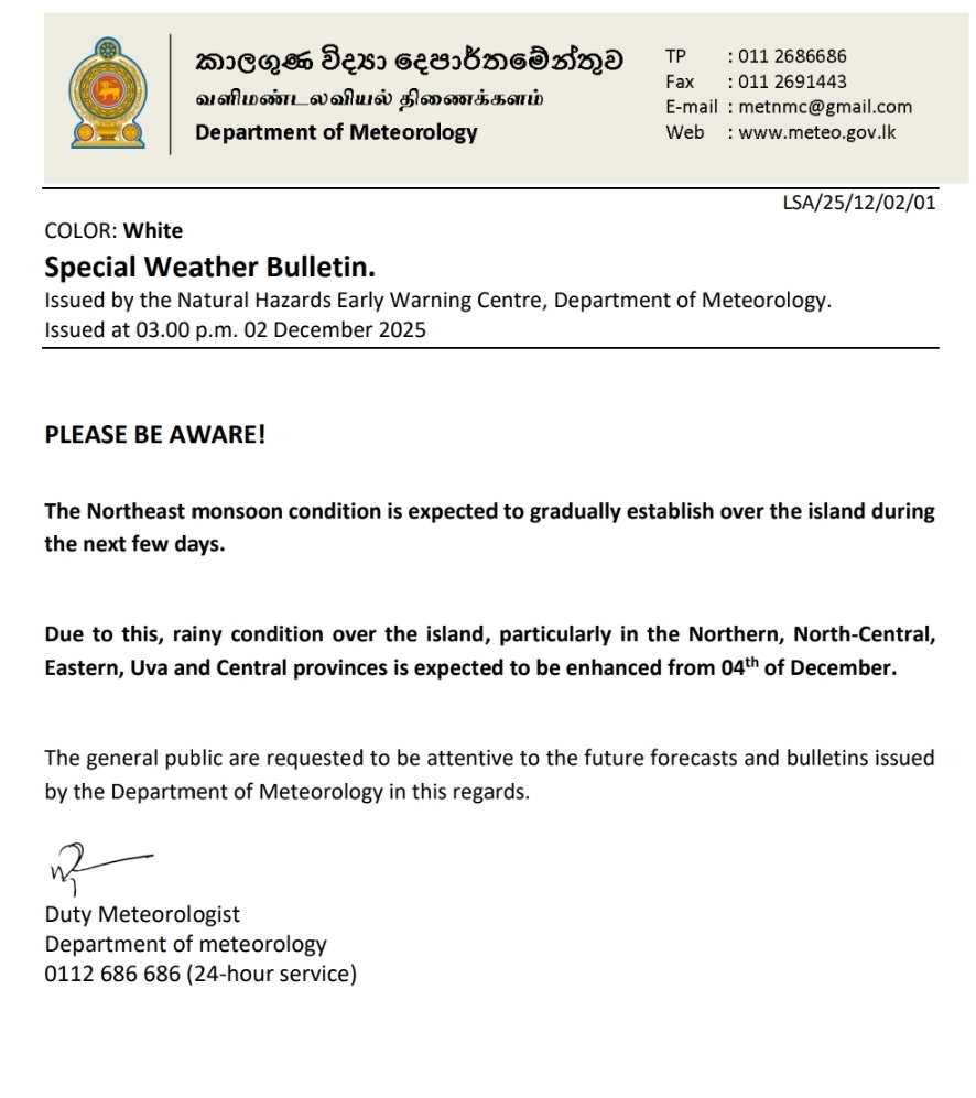 Due to this, rainy condition over the island, particularly in the Northern, North-Central, Eastern, Uva and Central provinces is expected to be enhanced from 04th of December.