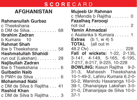 Former skipper Mohammed Nabi made a quick-fire 41 in 34 balls with 2 fours and 2 sixes. At one stage Afghanistan were 195 for 6 wickets but Sri Lankan bowlers fought back stronglytaking wickets at regular intervals to bowl them out for 228.