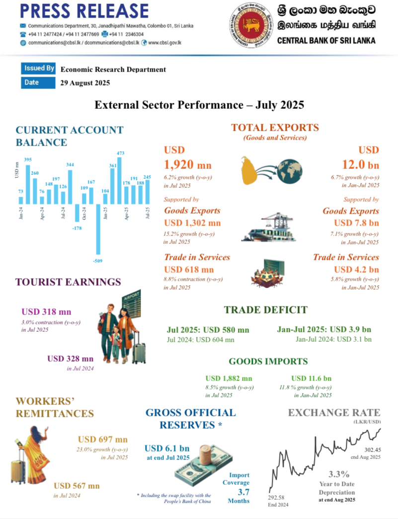 According to the Central Bank of Sri Lanka (CBSL), the country’s external sector strengthened further in July 2025, with the current account posting consecutive monthly surpluses.