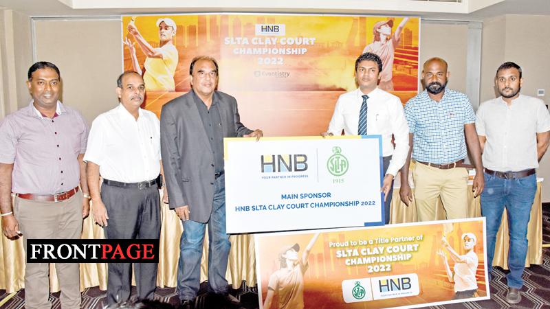 The President of Sri Lanka Tennis Association (SLTA)Iqbal Bin Issack (third from left )receiving sponsorship cheque from HNB Head and Marketing Upul Adhikari at the press briefing held at Hotel Renuka Kollupitiya . Also in the picture from left Anupa Mathamagoda Tournament Director , Pradeep Gunasekara SLTA Secretary , Bharathi Pillai SLTA Head of Development and Ifham Ariff Managing partner Eventistry