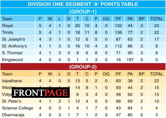 Last week, Royal completed their preliminary round fixtures with an impressive 17-3 victory over St. Joseph’s College to claim the top spot in Group-1 while Isipathana remained on top of Group-2 after they defeated Dharmaraja College 26-12.