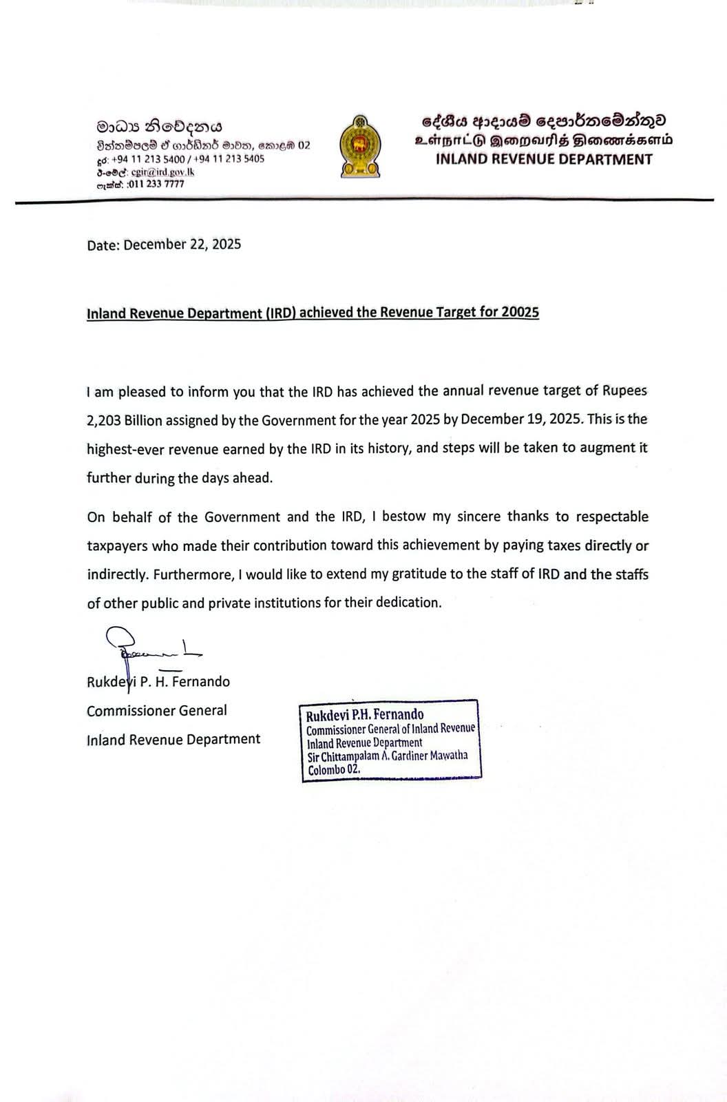 The Inland Revenue Department has met its full-year revenue target for 2025, collecting Rs. 2,203 billion by December 19, according to an official statement issued on Monday.