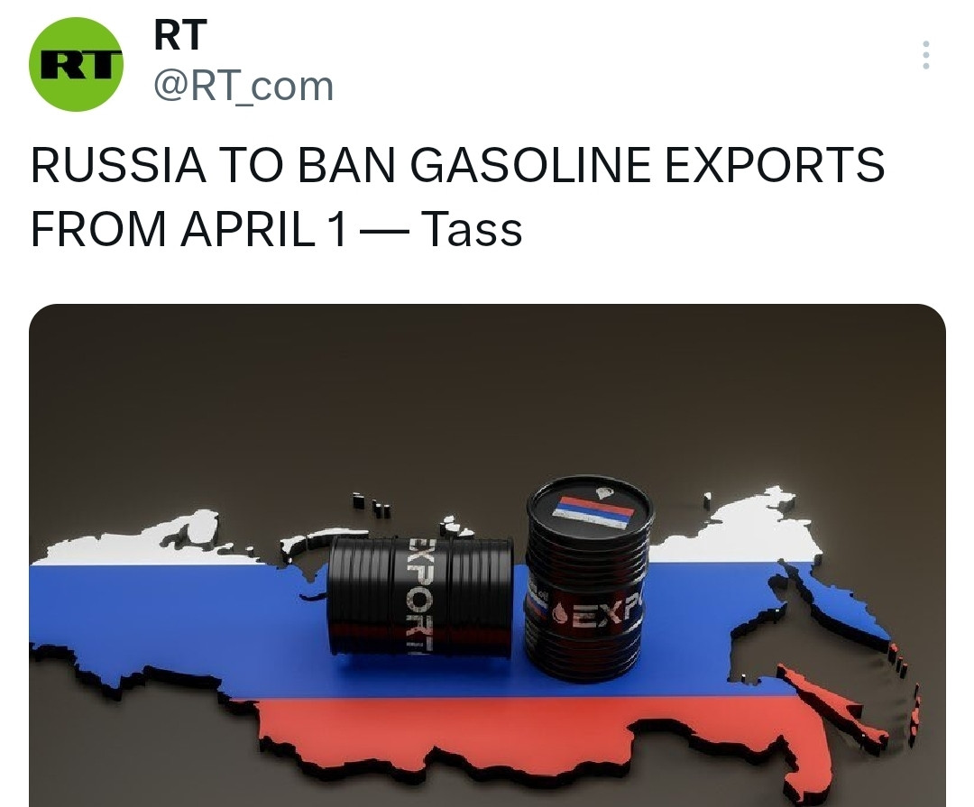 Russia plans to ban gasoline exports starting April 1 in a move aimed at stabilizing domestic fuel prices, according to reports by Russian state news agency TASS.